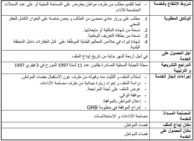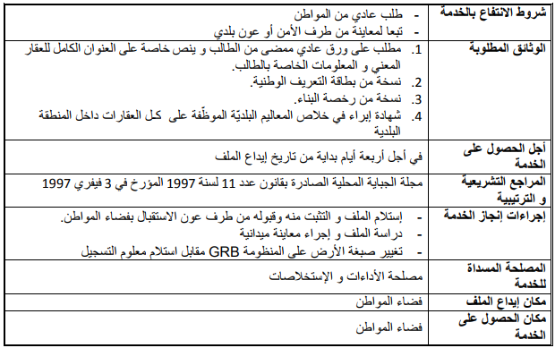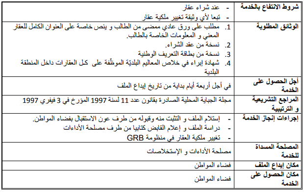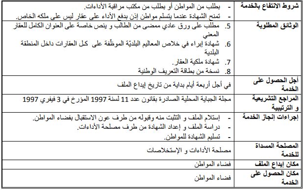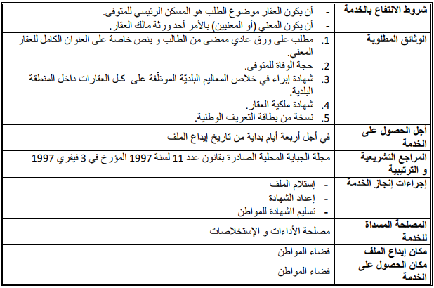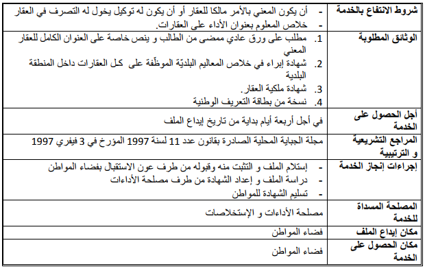شھادة المسكن الرئیسي شھادة ترسیم عقار بجدول التحصیل .شھادة عدم ترسیم عقار بجدول التحصیل .تغییر صبغة أرض غیر مبنیة إلى أرض مبنیة تغییر ملكیة عقار شكوى تخص المساحة الخاضعة للأداء طلب الإعفاء من ضریبة الإیجار